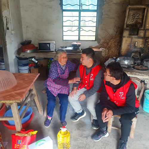 當天一大早,項目志愿者們組織起來,一同來到平安鎮平海村村委會,在村委會的帶領下來到81歲的獨居老人唐大娘和89歲抗美援朝老兵遺孀中的家中,老人們看到志愿者到來時,臉上露出了開心的笑容。志愿者們拉著老人的手,關心詢問老人們的生活和身體狀況,陪他們聊起家常,并叮囑他們,秋冬季節,要注意保暖,保重身體向他們致以節日的問候和美好的祝愿。這些舉措讓老人們深深感到了溫暖和開心。隨后,志愿者們為老人送上米、面、牛奶和食用油等慰問品,老人們拿著禮品笑著說道,“謝謝,感謝你們的關心”。