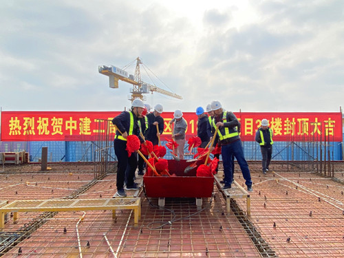 2020年11月20日,中建二局華東公司江北新區2018G05租賃住房項目歷時612天,實現了項目首棟樓順利封頂。在禮花聲中,康安置業法定代表人唐軒、甲方各領導、監理負責人、勞務單位代表將最后一方混凝土鏟進了料斗,在所有人員的歡呼聲中,最后一方混凝土被塔吊司機緩緩的吊至3#樓樓頂并完成澆筑。