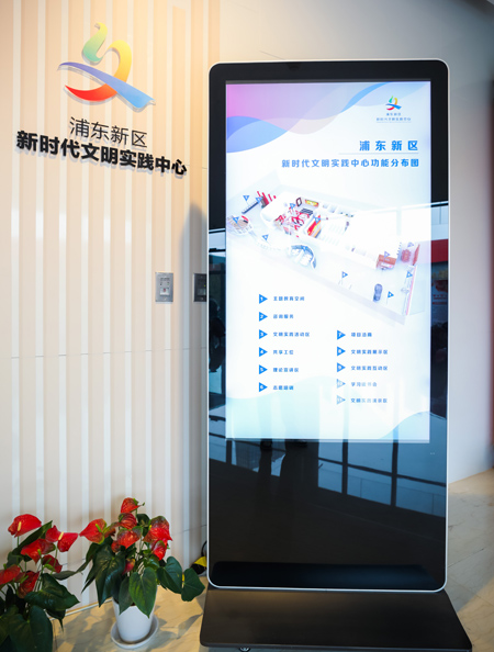 此次全新亮相的區級新時代文明實踐中心位于浦東圖書館內,與區黨建服務中心場地共享、資源共用,設置有咨詢服務、主題展示、志愿服務及培訓、項目洽商、文明實踐展示、文明實踐互動、文明實踐大數據等七個功能板塊。比如在文明實踐展示區,集中以“紅色旗幟”“生態圈”“服務樞紐”“資源地圖”四大板塊介紹了浦東的特色亮點;在文明實踐互動區,市民可以通過觸摸屏,完成互動海報的創作、打印,親身參與一次文明實踐活動。同時互動區以“約見”為主題,以“一期一約、遇見精彩”的形式,不定期開展各類直播活動,宣傳文明實踐的理念。