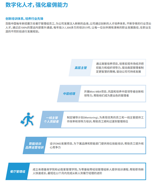 近100%的營運內部晉升通道,每年1300多萬小時的培訓時長(人均60小時培訓時長),百勝中國為員工提供了清晰的職業發展路徑,幫助員工在職業生涯的不同階段進行發展規劃。