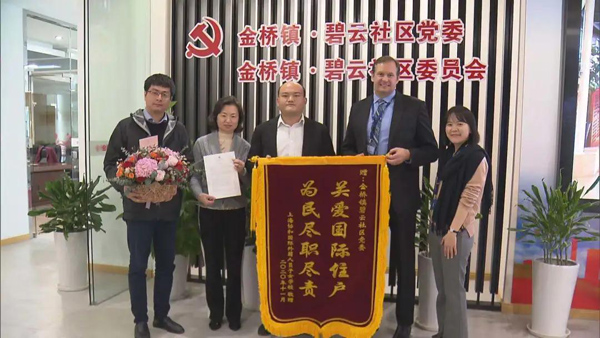 12月4日下午,上海協和國際學校校長道格·格拉夫博士、校人力資源總監吳卓琴女士帶著校方滿滿的敬意、祝福以及今年以來從國外回滬的全體校方外籍教師員工、家屬以及外籍學生們的感謝,來到金橋鎮碧云社區黨委,送來外籍教師的聯名感謝信和錦旗,感謝金橋鎮碧云社區黨委以及居委在今年社區疫情防控中所做的辛勞努力。