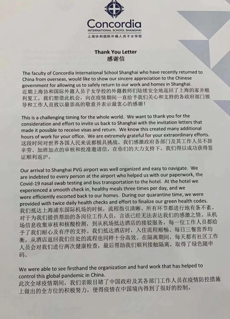 “起初接到校方要送感謝信的來電,感到很意外!北淘粕鐓^黨委副書記、社區委員會主任楊燕說,碧云社區作為一個國際化社區,有很多知名國際學校和涉外居住社區,各個國家居民的生活習慣和文化背景各異。在全年的疫情防控工作中,社區干部們起初還較為擔心外籍居民對于防疫措施是否能夠充分的理解、認可和遵守。