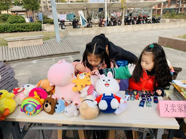 廣場上,愛心義賣活動正如火如荼地進行中,每個義賣展臺上放滿了共建單位和孩子們的捐贈物資:有玩具、杯子、金屬筆筒、書籍、衣服、護腰帶、茶葉、杯子……