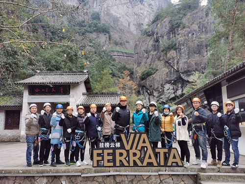 大家將安全裝置掛在鋼索上,手抓扶手、腳踩踏步,緩慢前行,而攀爬過程不僅需要技巧,對大家的體力和耐心同樣也是一種考驗。途中經歷多段垂直的崖壁,且需穿過三段水平懸空的鋼索橋,懸空已久的雙臂也顯得乏力,久久看不到終點,選手們內心也難免產生些許暴躁!坝行┪恢每梢阅_踩山體,稍作休息”,“這踏步也太硌腳了,還是腳踏實地舒服啊”,“就快到終點了,大家再堅持一下”,就這樣團隊之間相互照應,凝心聚力,穩中求進,最終歷時四個小時左右全部順利抵達終點,大家的臉上也洋溢著自豪感和成就感,在這次實現自我挑戰的旅途中畫上了一個完美的句號。