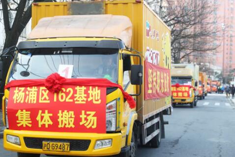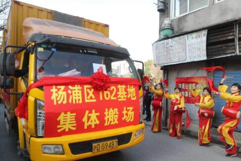 今天是新年第一個工作日,也是江浦路街道162街坊舊改征收基地居民集體搬離舊屋的日子。7輛披紅掛彩的搬場車早已等候在遼源二村門口,整裝待發。