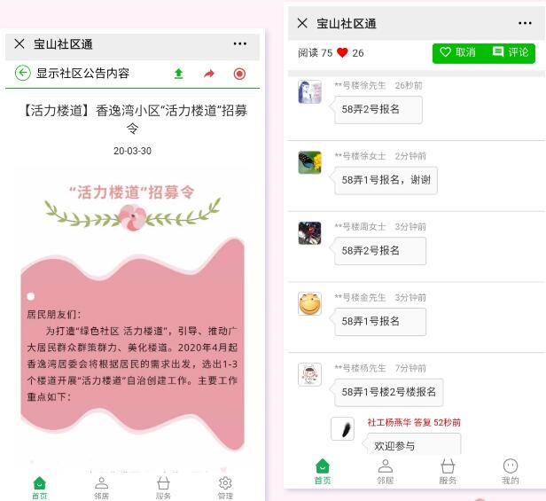 2020年,香逸灣居委會將“活力樓道”打造項目列為全年工作重點。一道“社區通招募令”,搭建了一個平臺。58弄1號樓、2號樓的居民積極報名“活力樓道”創建,展現了居民對社區建設的熱愛~