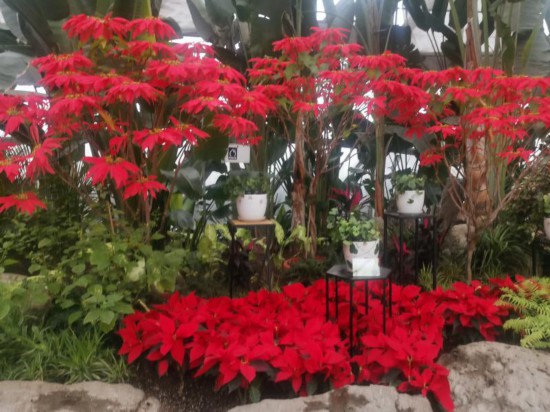 在辰山植物園展覽溫室熱帶花果館中,原產中美洲的一品紅和原生于東非及馬達加斯加等地的非洲芙蓉開得正盛。