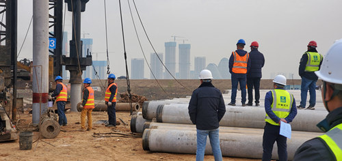 在樁基施工過程中,武漢智能網聯項目項目團隊披星戴月、銜枚疾進,高效優質地推進前期設計等各項工作,克服了砂層地質上施工預應力管樁的難題,投入大型樁基施工設備15臺,先后完成了試樁施工及檢測、焊縫檢測、工程樁施工及靜載等一系列工作。