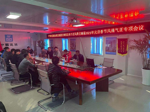2020年12月30號下午,中建二局華東公司廣州片區聯合黨支部星匯灣花園項目召開了正風肅紀確保2021年元旦春節期間風清氣正專項會議,會議由項目黨支部書記林海濤主持,項目全體班子成員以及關鍵崗位管理人員參加會議。