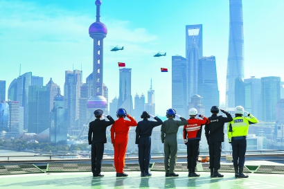 昨天上午,上海警務航空隊派出了兩架155中型直升機,分別懸掛國旗和警旗,編隊飛過外灘黃浦江上空,慶祝首個“中國人民警察節”。本報記者 張海峰 攝