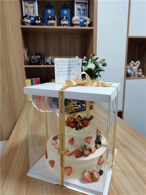 當天下午15時30分許,一位年輕小伙來到奉賢公安分局齊賢派出所,將一盒精美的蛋糕放在派出所門口,沒有留下姓名就離開了。蛋糕的賀卡上寫著“社區的治安離不開每天在我們身邊的人民警察,在這第一個人民警察節里,祝福我們的人民警察平安!健康!如愿!”