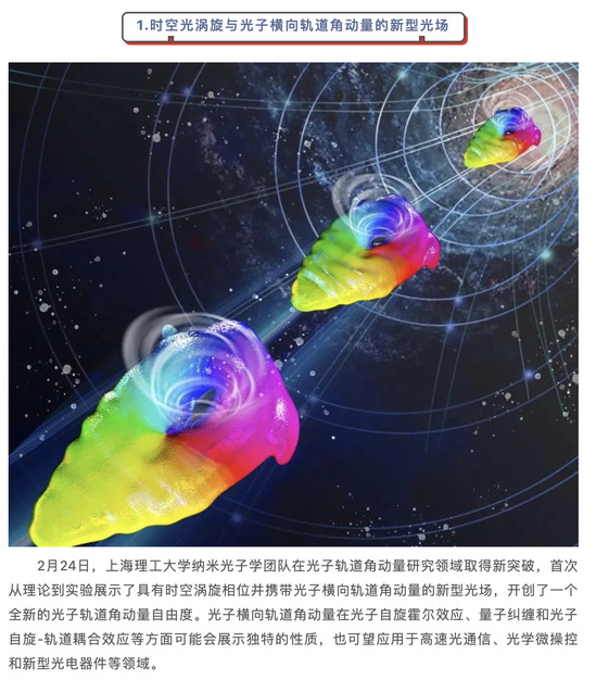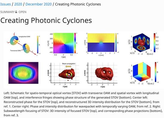 然而,在莊松林院士的指導下,上理工詹其文教授帶領的納米光子學團隊歷時2年,創造性地將這兩個領域 “合二為一”,首次從理論到實驗展示了具有時空渦旋相位并攜帶光子橫向軌道角動量的新型光場,開創了一個全新的光子軌道角動量自由度。相關研究成果發表在世界光學頂尖期刊《自然-光子學》上,并成功入選美國光學學會(OSA)評選的2020年度全球30項光學重大進展。據了解,國內僅有4家單位入選,且上理工為獨立完成單位。
