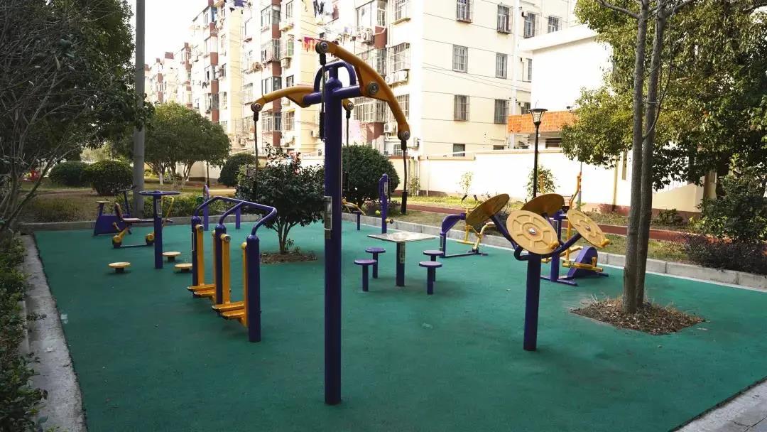 位于東方社區的健身設施區域內,平步器、扭腰器、壓腿器、腰背按摩器、上肢牽引器等室外健身器械一應俱全,并選用了EPDM塑膠地面,新鋪設的塑膠地面外觀鮮艷、耐磨損,可全天候使用,不僅讓健身點看上去更為整潔美觀,也大大提升了安全性。