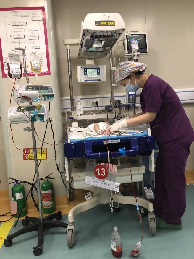 于是,在一個深夜,當醫院外面萬籟俱寂的時候,喀什二院新生兒科內燈火通明,新生兒科醫護組成急救換血團隊,緊急行動,從市血站特配400ml B型Rh陰性血。在須麗清主任指導下,護士長張文娟進行外周動、靜脈同步換血的重要操作,動脈放血,靜脈同時輸入紅細胞和血漿,時刻關注血液的進出平衡,監護新生兒的生命體征平穩。