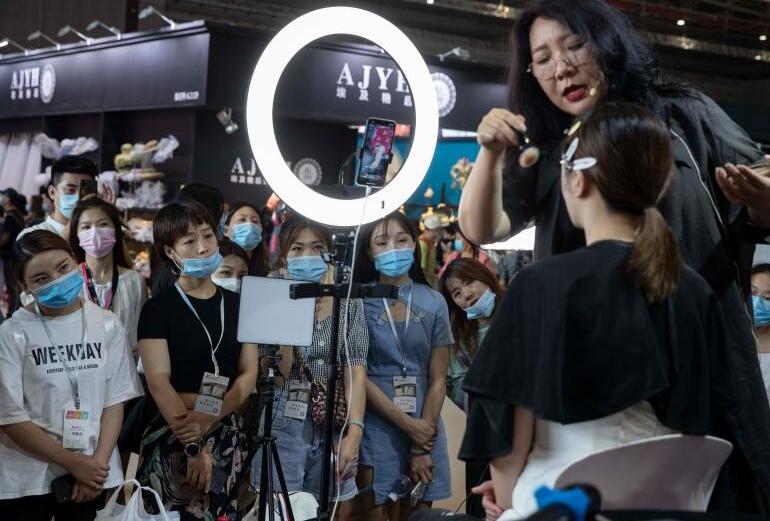 2020年7月8日,第37屆上海國際婚紗攝影器材展覽會攜手第22屆上海國際攝影器材和數碼影像展覽會、2020上海國際兒童攝影展覽會亮相國家會展中心(上海)。本次展會線下“三展聯動”,線上則推出“云上會展”。圖為一名化妝師在展會上一邊直播一邊演示化妝技巧。賴鑫琳攝