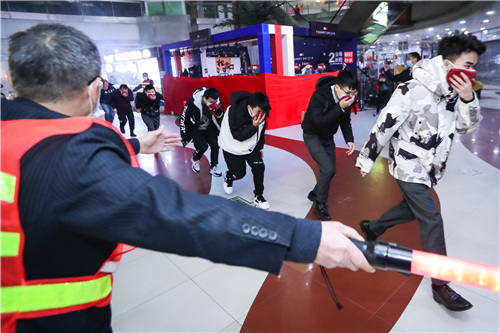 演練假設龍之夢購物中心B1樓一餐廳廚房起火發生火災,單位微型消防站先期處置未果,火勢迅速蔓延擴大,短時間內濃煙四起,部分群眾被困。商場工作人員發現情況后,第一時間利用滅火器救火,并報告單位微型消防站,同時撥打119報警電話。