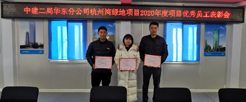 2021年1月6日,中建二局浙江分公司寧波杭州灣綠地項目部開展2020年度項目優秀員工表彰活動,在項目全體員工大會上對獲得優秀員工稱號的三名員工進行表彰,并頒發榮譽證書和紀念品。