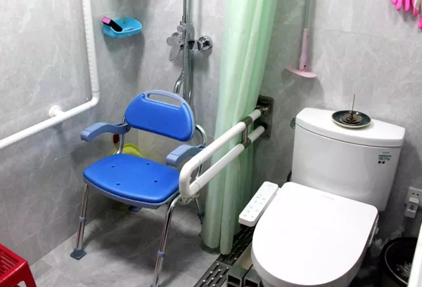 居民家完成了“一戶一方案”居家適老性改造,浴室內裝上了“L型”扶手、活動助浴凳,坐便器裝上了扶手和智能馬桶蓋等。