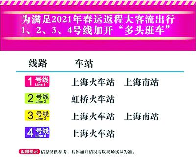 為重點緩解“春運”后半段、即返程大客流集中到達、集中換乘地鐵的大客流壓力。2月16日(年初五)起,上海地鐵1、2、3、4號線將實施“多頭班車”方案,即1、3、4號線上;疖囌菊,1、3號線上海南站站,以及2號線虹橋火車站站將在首班車前后,視具體情況投放列車,及時疏運守候地鐵首班車的返程大客流,避免滯留乘客與日常通勤流疊加的擁擠現象。