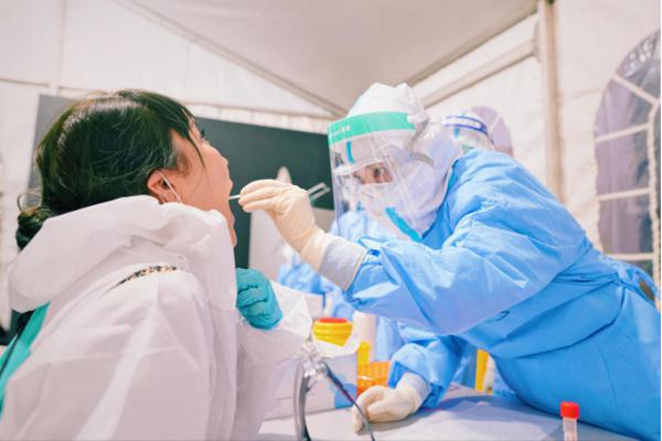 海關工作人員對入境旅客進行咽拭子采集。上海海關供圖