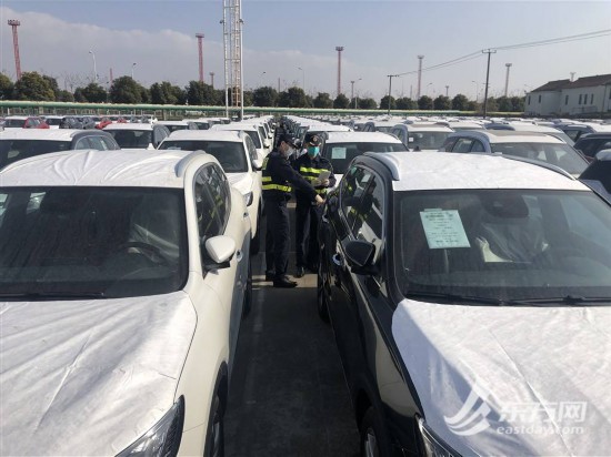 1月19日,上海外高橋港區關員在海通汽車碼頭對出運海外的汽車進行核驗.