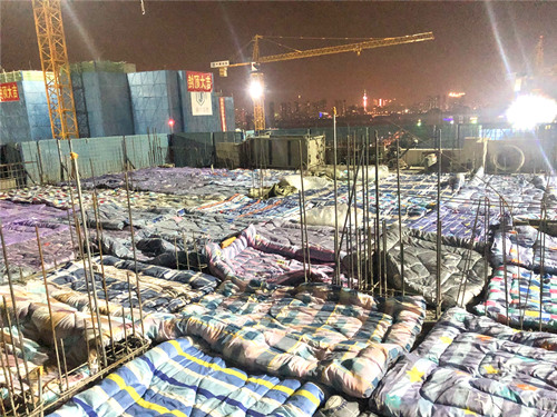 1月9日21點,由中建二局華東分公司承建的江北新區2018G05租賃住房項目4#樓31層剛剛完成混凝土澆筑,可當時的溫度已至零下8℃,混凝土等主要建筑構件如一旦發生凍害,將帶來巨大的質量隱患,于是我帶著好奇向工程部提出疑問,4#樓棟號長信心滿滿的說:“這混凝土可是蓋了被子的!薄皐hat?混凝土蓋被子!”“對,就是對混凝土的養護,表面先鋪薄膜,再覆蓋棉被,可以減小混凝土內外溫差,防止表面裂紋,就像你們女生,貼面膜保濕是一個道理”這樣解釋后我好像明白了許多!安粌H如此,我們室內還使用了無煙煤爐升溫,并派專人看管,棉被也是重復利用的,拒絕資源浪費! 4#樓棟號長又補充道。