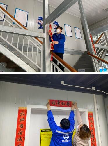 據韓建勇透露,項目已經進行到主體結構即將完工的階段,后續還會有裝飾裝修、機電安裝、綠化和道路施工的內容。這個春節雖然工友不能回老家,但是項目工地也有家的氛圍,火紅的燈籠,寓意美好的春聯,都已經準備好了。希望大家能安安心心、快快樂樂把這個新春佳節過得圓滿。