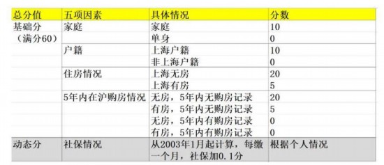 規則一出,不少人紛紛默默算起自己能得多少分。經濟學家、如是金融研究院院長管清友也為自己算了一筆賬,粗略算下來他差不多有60多分。根據規則,已婚、上海戶口、名下無房且5年無購房記錄、社保繳納年限長的可優先加分;痉肿罡60分,包含家庭、戶籍、住房狀況、在滬購房記錄4個基本項;動態分部分,由社保繳納月數和對應系數相乘而來,最高可達52.08分,因此可能出現總分超過100分的情況。