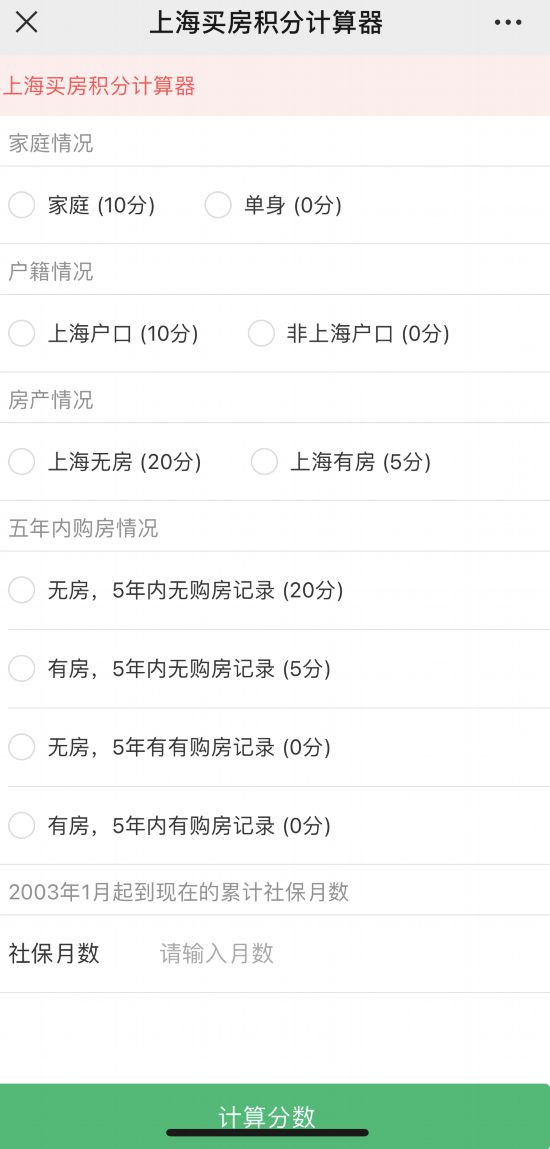 “我是上海戶籍,名下有一套房,單身未婚,能得幾分?”今天,一款名為“上海買房積分計算器”的小程序在不少買房群中被網友們使用。在上!皽畻l”樓市調控新政出臺后,首批新開樓盤上市銷售首次采取計分排序搖號程序,令不少購房者打起“小算盤”,還有人疑慮:“我過及格線了嗎?”