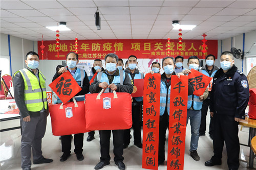 1月26日,中建二局江蘇分公司南京仙林中醫醫院項目開展“新春送!边M工地活動,邀請了南京市棲霞區西崗街道攝山派出所所長胡久才來到項目工地現場揮毫潑墨,通過送福的方式,書寫春聯和“!薄傲钡茸謽。同時為堅守工地一線的建筑工人和項目職工送去棉被、床單被套、堅果大禮包、水果等慰問物品,讓工友們感受到濃濃的年味和溫暖。