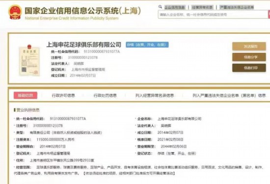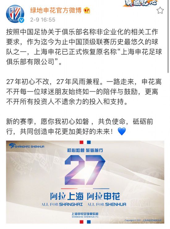 2月9日最新消息,按照中國足協關于俱樂部名稱非企業化的相關工作要求,作為迄今為止中國頂級聯賽歷史最悠久的球隊之一,上海申花已正式恢復原名稱“上海申花足球俱樂部有限公司”。