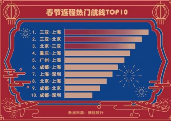 農歷初五、初六(2月16日、2月17日)為今年春節假期返程高峰期,在“就地過年”倡議下,返程高峰亦在平穩有序中展開。來自攜程機票大數據顯示,三亞-上海、三亞-北京、北京-三亞、重慶-上海、廣州-上海、成都-上海、上海-深圳、北京-上海、成都-北京、成都-深圳入圍春節返程熱門航線TOP10。