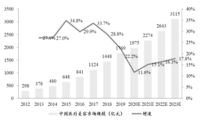 當前,國內醫美市場保持高增長態勢且潛力巨大。東吳證券研究表示,國內醫療美容市場正呈現出快速發展的趨勢,根據艾瑞咨詢統計與預測,2020年中國醫療美容市場規模約1975億元,同比增長11.6%,受疫情影響,行業增速略有下降,但未來將逐步提升。預計2023年市場規模達3115億元,2019至2023年年均復合增長率為15.2%。