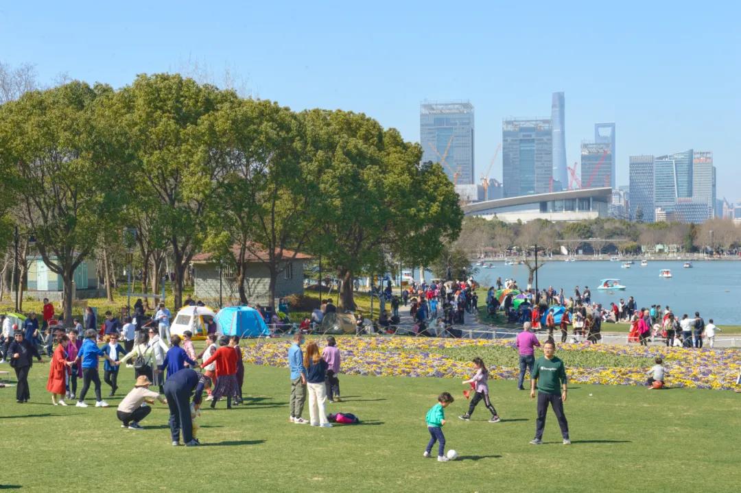 公園各個角落,都是一派熱鬧氛圍。大草坪上,大人小孩嬉戲玩耍;景觀湖內,一條條游船乘風破浪;道路中,游人與觀賞自行車和諧相處。