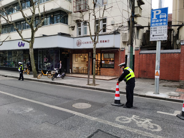 徐匯區宛平路作為連接肇嘉浜路和淮海中路的主要干道,高峰時段承擔著較大的通行壓力。學校早晚高峰接送學生的車輛占非機動車道停車,造成非機動車在機動車道及人行道上混行,存在較大安全隱患。同時,在距離校門南側20米處設置有一公交車站,道路臨時停車情況影響公交車的正常出入站臺,加劇了宛平路的擁堵。但徐匯警方并未簡單通過加裝隔離欄一禁了事,而是秉持治理思維與校方、與街道一同探索兼顧便捷與安全的最佳方案。