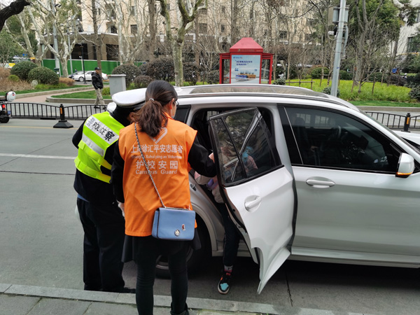 民警和家長志愿者護送學生下車后進校(徐匯公安分局供圖)