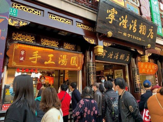 得益于春節長假對消費的拉動作用以及原地過年的濃郁氛圍,豫園商圈內的一干餐飲老字號,如:綠波廊、上海老飯店、南翔饅頭店、春風松月樓、松鶴樓等在節假日期間也生意火爆,平均排隊等位時間都在半小時左右。臨近元宵節,寧波湯團店的人氣開始陡然飆升,不少市民走過路過都要品嘗一下傳統的寧波湯團。