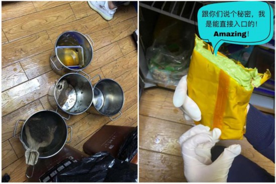 熊姬門店的管理相對疏漏更多,該店待加工的橙子等水果與百潔布堆放在一起;垃圾溢出,工作人員未及時清理垃圾桶;廚房地面潮濕臟亂、煮完的茶葉不及時清理,隨意放在地上;部分原料不封口、不加蓋,直接放入臟亂差的柜子、制作臺。