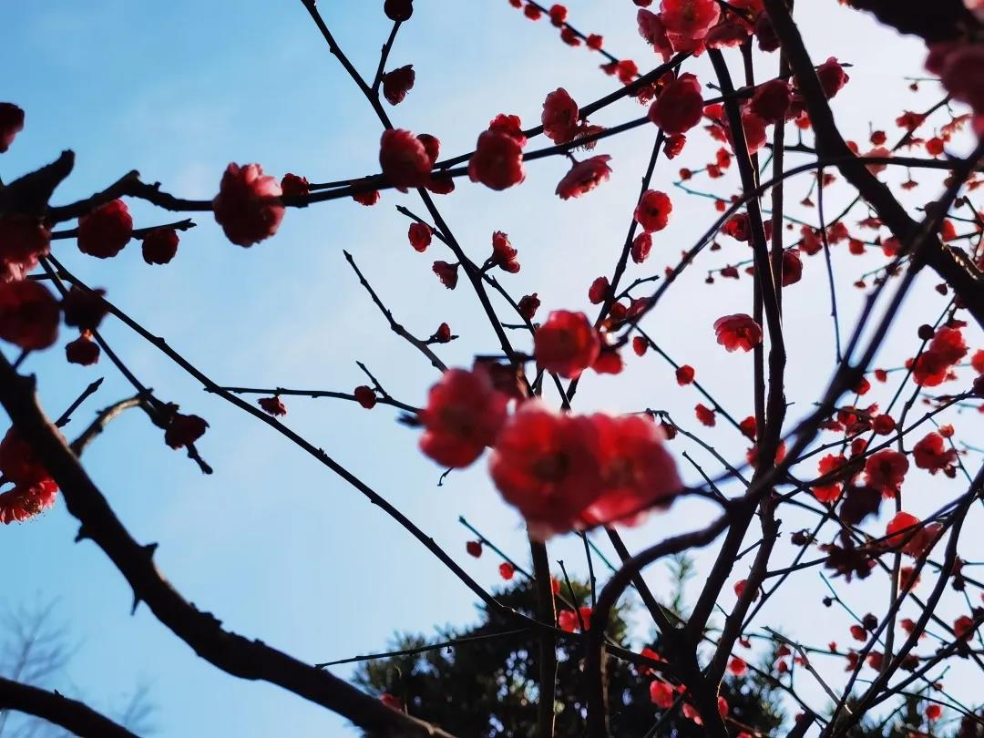 沿著小徑往里走去,一片梅花林早已吐蕊綻放,或粉或紅的春梅連叢成片,游客穿行于林間,花飄影搖,動靜相宜,別有一番風情。嫣紅如火的山茶花素來不懼嚴寒,愛與臘梅爭姿。暖陽之下的山茶少了一份孤高,卻多了一份明媚與嬌艷。風中的花信吹開了花苞,也吹綠了荷花池旁的垂柳,枯枝上再次抽出的嫩芽,散發著勃勃生機。