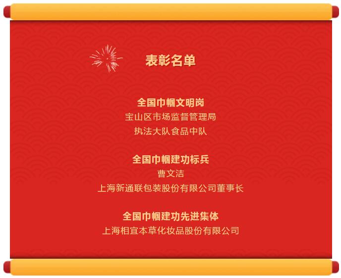 其中,上海市寶山區市場監督管理局執法大隊食品中隊被評為全國巾幗文明崗,上海新通聯包裝股份有限公司董事長曹文潔被評為全國巾幗建功標兵,上海相宜本草化妝品股份有限公司被評為全國巾幗建功先進集體。
