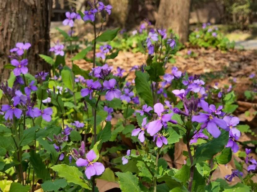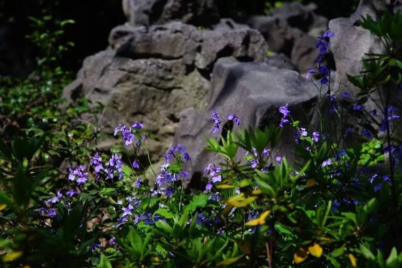 走進古猗園,在銀杏樹下、香樟林下,到處可見或成片種植、或零星栽植的二月蘭。盛開時節,成片種植的二月蘭宛若一片紫色的海洋,微風吹過,齊整的花朵似波浪般隨風擺動;而孤植的二月蘭星星散散的分布于各處,形成“萬綠叢中一點紫”的美感,自帶神秘感的紫色花瓣在綠葉的襯托下更顯高貴端莊。