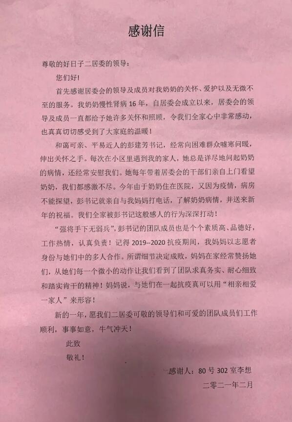 張秀芳老人身患腎病、糖尿病16年,社區工作人員了解情況后,經常上門看望老人,詢問病情,關心她生活的點點滴滴,每逢節日總不忘記陪老人一起度過。張阿姨家人回想到入住以來社區對她們的關心和幫助,感慨地說道:“社區當我們自家人,十幾年如一日地關心著我們,送上錦旗和感謝信,只想說一句,謝謝!