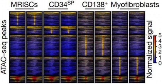 圖3. MRISC具有獨特的表觀遺傳特征 圖片顯示小鼠結腸MRISC,CD34SP,CD138+,Myofibroblast間質細胞ATAC-seq的熱圖結果,顯示同其它腸道間質細胞比較MRISC具有獨特的染色體開放區域。