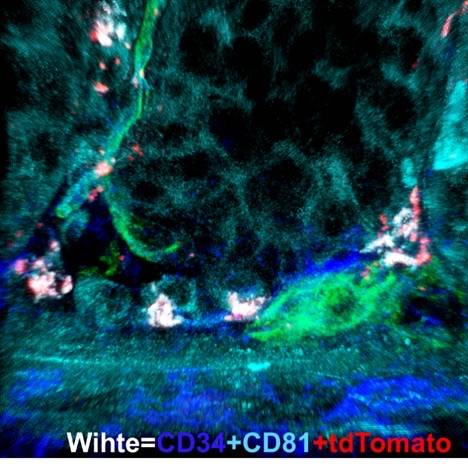 圖2. MRISC位于腸道干細胞Niche底部 圖片是Rspo1-tdTomato小鼠結腸通過免疫熒光染色的方法顯示MRISC(CD34+CD81+tdTomato+)(白色)位于腸道隱窩干細胞底部。