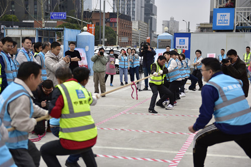上午10點,中建二局上海大悅城項目部內已是一派熱鬧的景象!凹佑!加油!”……工友兄弟和項目員工正在進行激烈的拔河比賽,吶喊助威聲此起彼伏,將拔河比賽推向了高潮。
