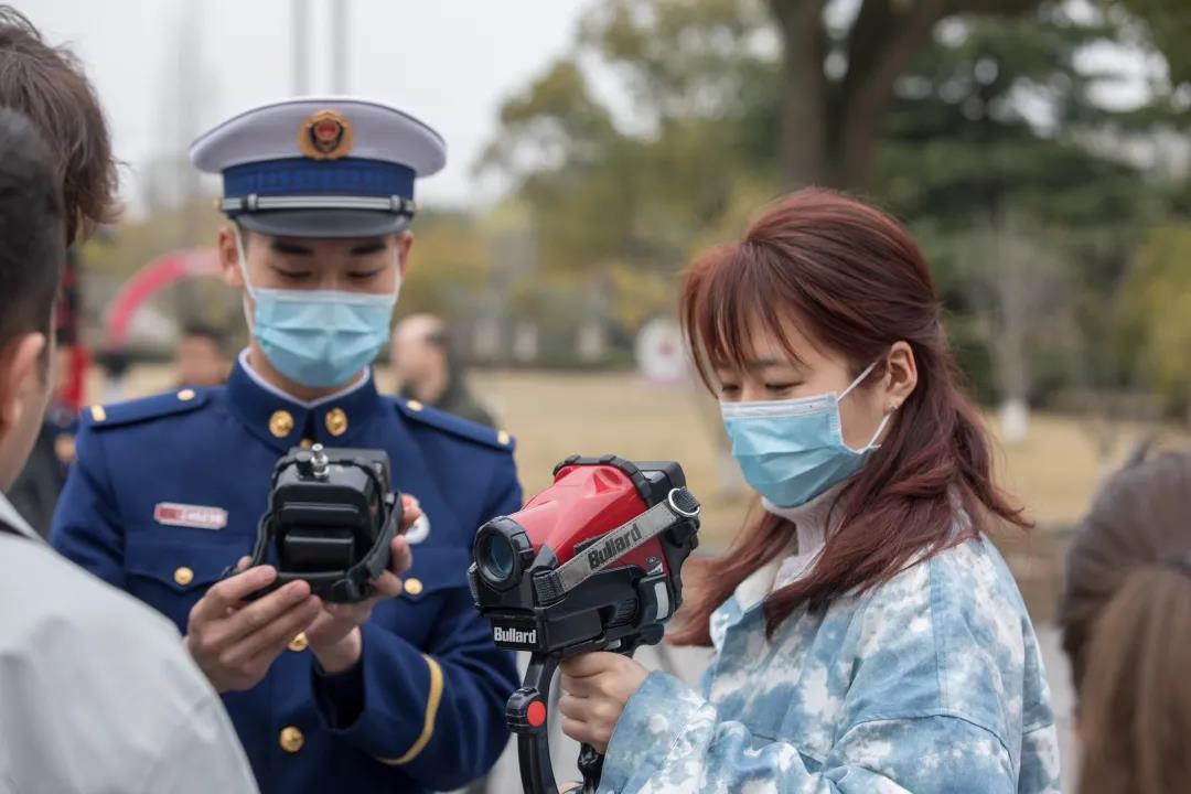 隨后在學校廣場上,消防宣傳員向大家現場演示了干粉滅火器正確使用方法,并讓學生們親自體驗滅火器的使用,更好地掌握應對火災事故的基本技能。在裝備器材展示區,各式各樣的滅火及搶險救援器材吸引了在場師生的眼球,消防宣傳員向大家詳細介紹了各種器材的適用范圍和使用方法,帶領大家認識了日常消防救援中常見的消防斧、鐵鋌、水槍水帶等器材工具,講解了它們的性能及使用方法,并讓學生們互動體驗一些消防器材,過足一把“消防癮”。