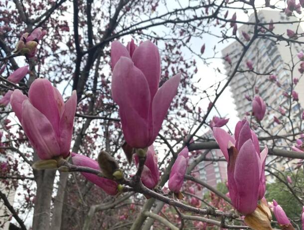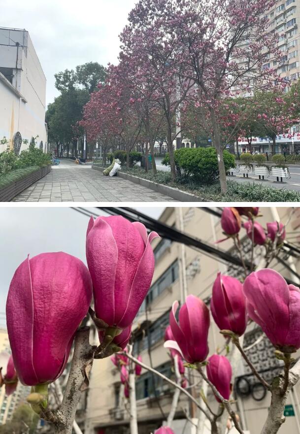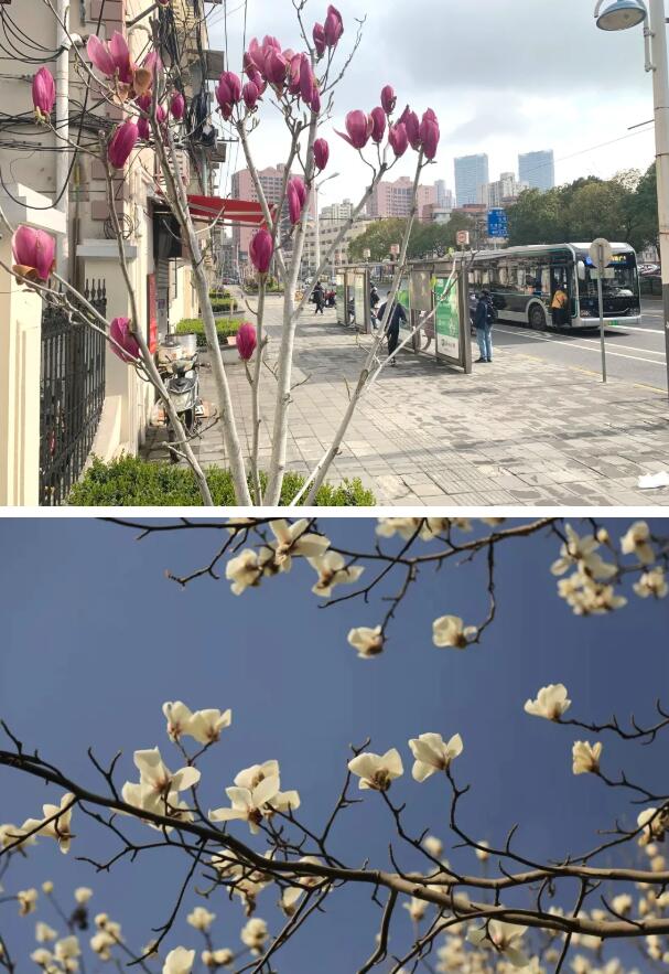 還有熱心市民說,每年春天都要特地來大連路這一片逛逛。這里的玉蘭樹大概分幾種,白玉蘭、二喬玉蘭和紅運玉蘭,花色也是由淺入深。其中白玉蘭很好分辨,二喬玉蘭是白玉蘭和紫玉蘭的雜交品種,花蕾卵圓形,花先葉開放,淺紅色至深紅色。紅運玉蘭的花瓣則是由外到里,由紫紅深紅淡紅到白色。