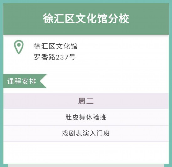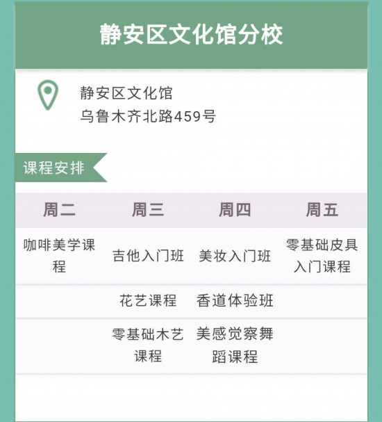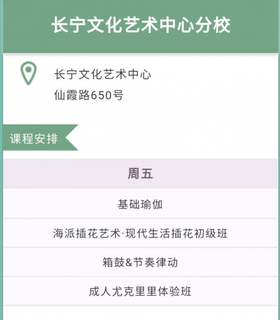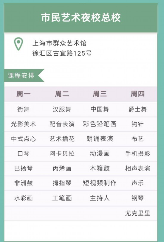 首期推出的四個分校按照自身特點設置課程。市民藝術夜校靜安校區針對白領人群開設咖啡美學、花藝等舒壓課程。徐匯校區周邊聚集了不少全職媽媽,肚皮舞體驗班、戲劇表演入門班等課程將幫助她們更好提升自己。長寧校區位于仙霞路,一條有名的美食街,夜晚比白天更為熱鬧,尤克里里、箱鼓等課程希望大家在晚上除了關注美食,也能享受文化大餐。虹口校區將開展瑜伽、國畫花鳥等具有地域特色的課程內容。