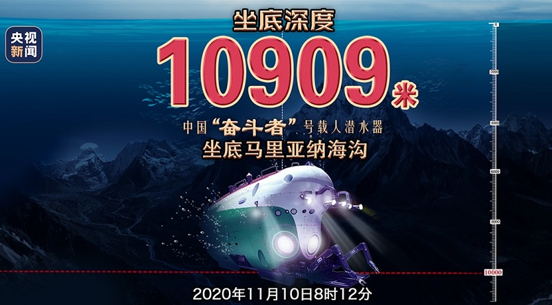 2020年11月10日,“奮斗者”號坐底馬里亞納海溝10909米的深度,創造了中國載人深潛新紀錄。