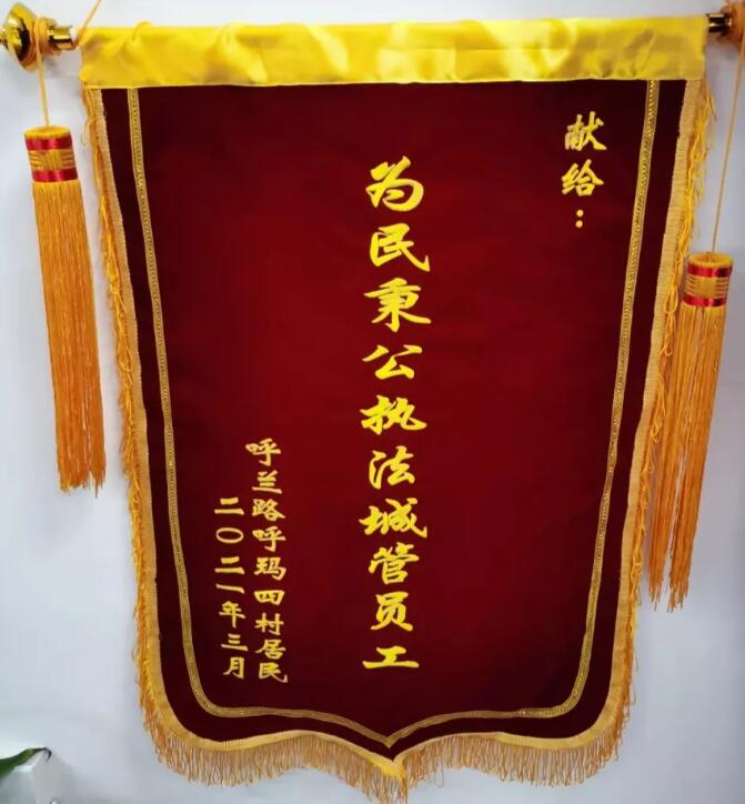 3月16日,呼瑪四村一居民將一面錦旗送至張廟中隊,感謝城管隊員解決了多年難題。